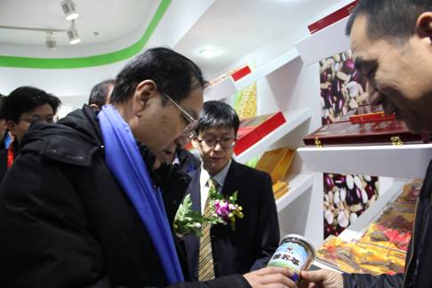 精品館館長(zhǎng)杜勇為王玉明副主席、郭健廳長(zhǎng)一行介紹肉類產(chǎn)品展區(qū)