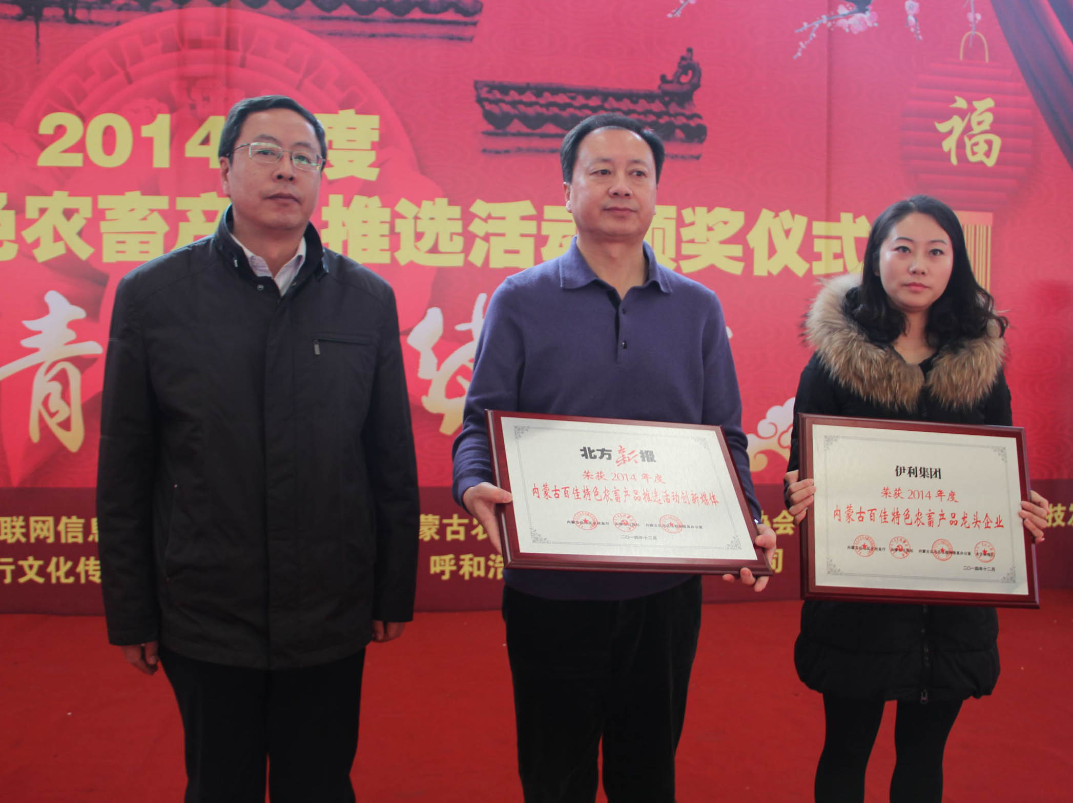 26日,由自治區(qū)農(nóng)牧業(yè)廳、內(nèi)蒙古日?qǐng)?bào)社、自治區(qū)網(wǎng)信辦主辦,內(nèi)蒙古農(nóng)牧業(yè)產(chǎn)業(yè)化龍頭企業(yè)協(xié)會(huì)、內(nèi)蒙古保全農(nóng)產(chǎn)品科技發(fā)展有限公司協(xié)辦,北方新報(bào)承辦的“內(nèi)蒙古百佳特色農(nóng)畜產(chǎn)品”推選活動(dòng)頒獎(jiǎng)儀式暨2015“青城年貨大集”在呼和浩特市保全莊農(nóng)貿(mào)市場(chǎng)2號(hào)廳正式開(kāi)幕。自治區(qū)農(nóng)牧業(yè)廳副廳長(zhǎng)賈躍峰、內(nèi)蒙古日?qǐng)?bào)社黨委委員、副總編輯孫亞輝、內(nèi)蒙古農(nóng)牧業(yè)廳產(chǎn)業(yè)化處處長(zhǎng)王補(bǔ)在、北方新報(bào)社總編輯李德斌、內(nèi)蒙古農(nóng)牧業(yè)產(chǎn)業(yè)化龍頭企業(yè)協(xié)會(huì)執(zhí)行會(huì)長(zhǎng)林永亮等出席頒獎(jiǎng)儀式,賈躍峰副廳長(zhǎng)在頒獎(jiǎng)儀式上致辭。此次評(píng)選活動(dòng)共112家農(nóng)牧業(yè)企業(yè)的120件產(chǎn)品被評(píng)選為“內(nèi)蒙古百佳特色農(nóng)畜產(chǎn)品”。獲獎(jiǎng)企業(yè)參加了此次2015“青城年貨大集”,展出了糧油、畜、禽、魚(yú)、蛋、奶、蔬菜、水果等多種特色產(chǎn)品,是首府春節(jié)前夕的一次大型展示、展銷(xiāo)、采購(gòu)活動(dòng)。