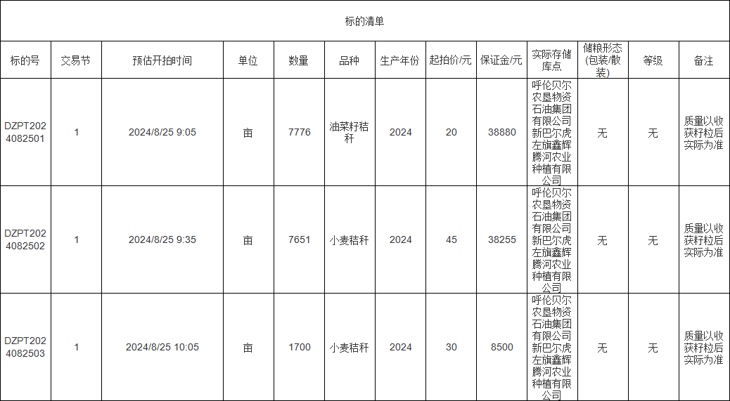 轉(zhuǎn)讓標(biāo)的為油菜籽秸稈、小麥秸稈、小麥秸稈,涉及面積油菜籽秸稈7776畝、小麥秸稈7651畝、小麥秸稈1700畝,意向受讓方在競(jìng)買(mǎi)前應(yīng)自行對(duì)標(biāo)的預(yù)估數(shù)量和質(zhì)量情況進(jìn)行充分了解,交易標(biāo)的均以實(shí)際狀況為準(zhǔn)。標(biāo)的存放地位于呼倫貝爾農(nóng)墾物資石油集團(tuán)有限公司新巴爾虎左旗鑫輝騰河農(nóng)業(yè)種植有限公司,詳情見(jiàn)標(biāo)的清單: