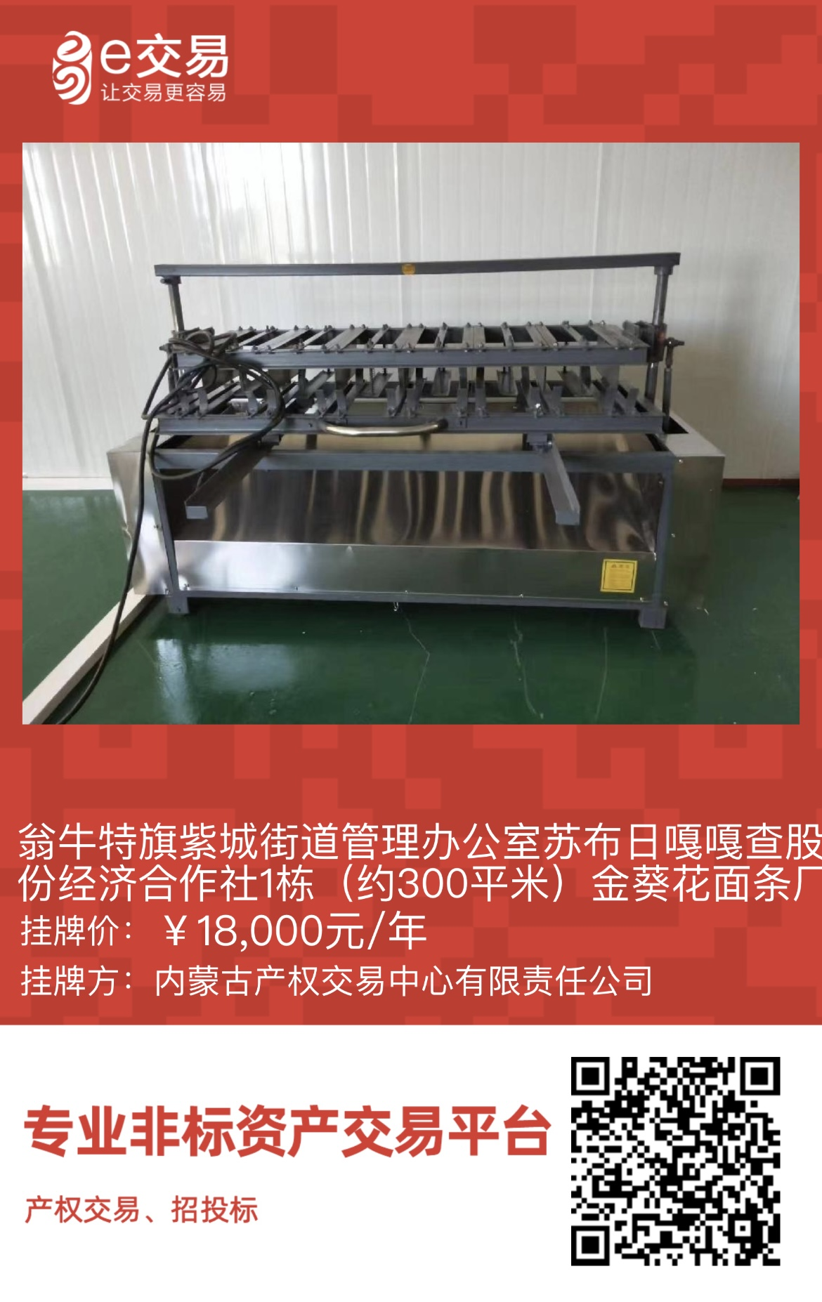 翁牛特旗紫城街道管理辦公室蘇布日嘎嘎查股份經(jīng)濟合作社1棟(約300平米)金葵花面條廠廠房及設(shè)備出租(租金18000元/年,租期5年)