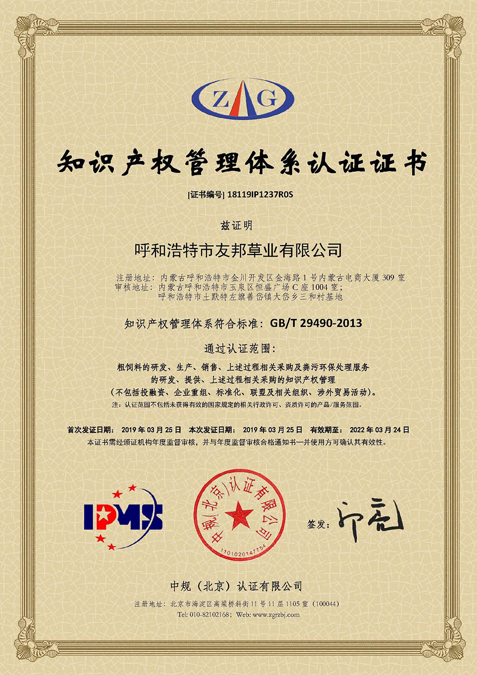 呼和浩特市友邦草業(yè)有限公司于2019年3月25日正式獲得由中規(guī)(北京)認(rèn)證公司頒發(fā)的《知識(shí)產(chǎn)權(quán)管理體系認(rèn)證證書》(證書編號(hào):18119IP1237R0S),這標(biāo)志著友邦草業(yè)在知識(shí)產(chǎn)權(quán)創(chuàng)造、運(yùn)用、管理和保護(hù)方面全面邁入國(guó)內(nèi)領(lǐng)先水平。