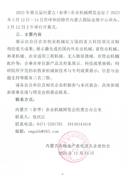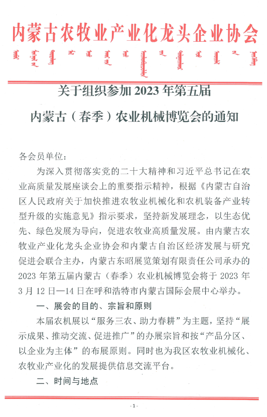關(guān)于組織參加2023年第五屆內(nèi)蒙古(春季)農(nóng)業(yè)機械博覽會的通知
