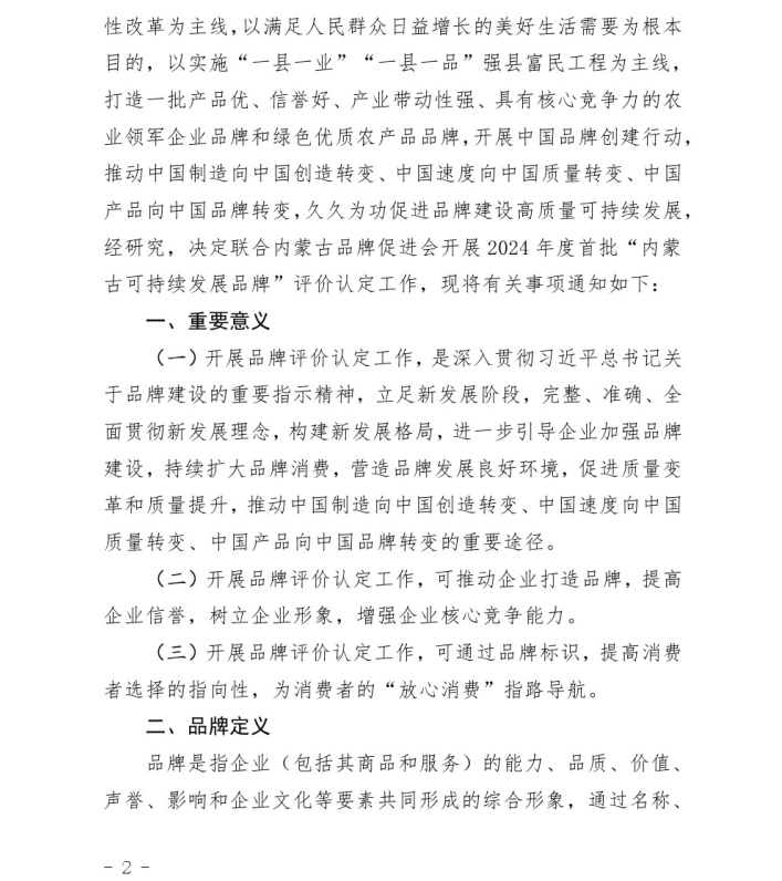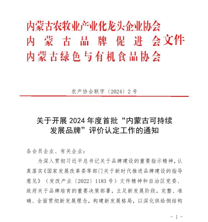 關(guān)于開展2024年度首批“內(nèi)蒙古可持續(xù) 發(fā)展品牌”評價(jià)認(rèn)定工作的通知