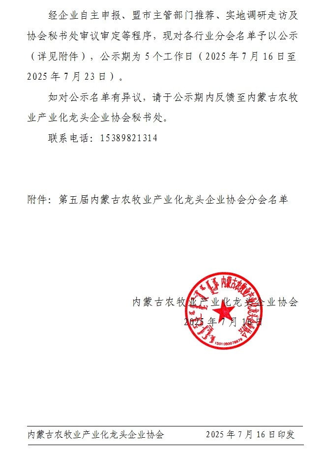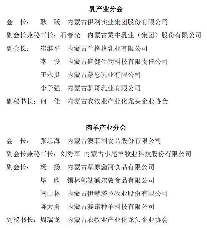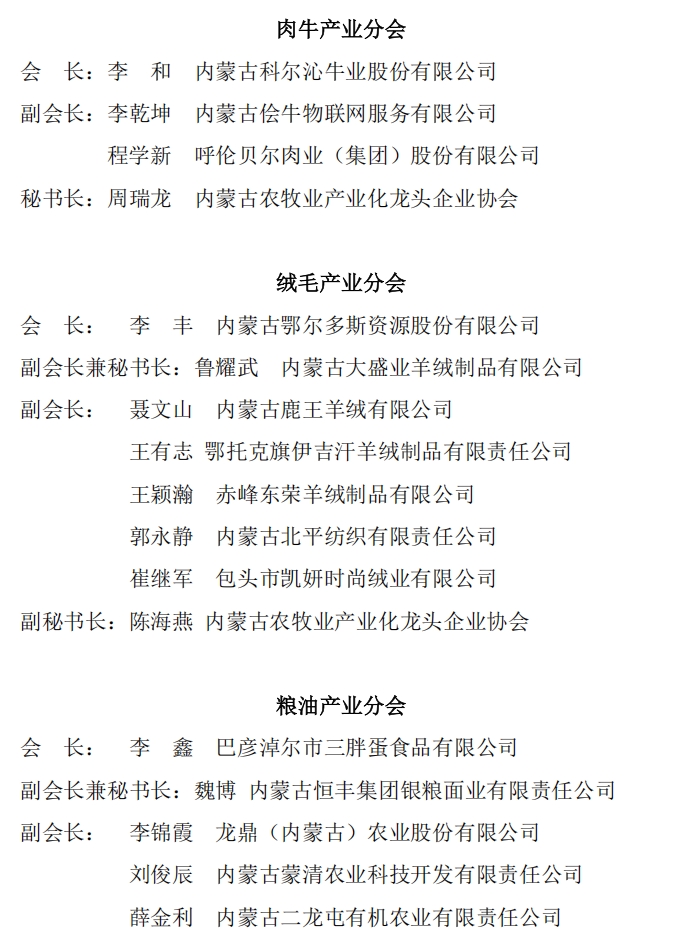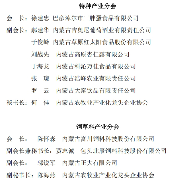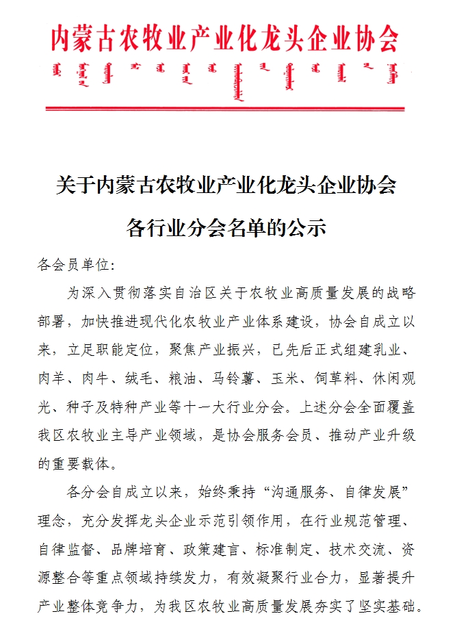 關于內(nèi)蒙古農(nóng)牧業(yè)產(chǎn)業(yè)化龍頭企業(yè)協(xié)會各行業(yè)分會名單的公示