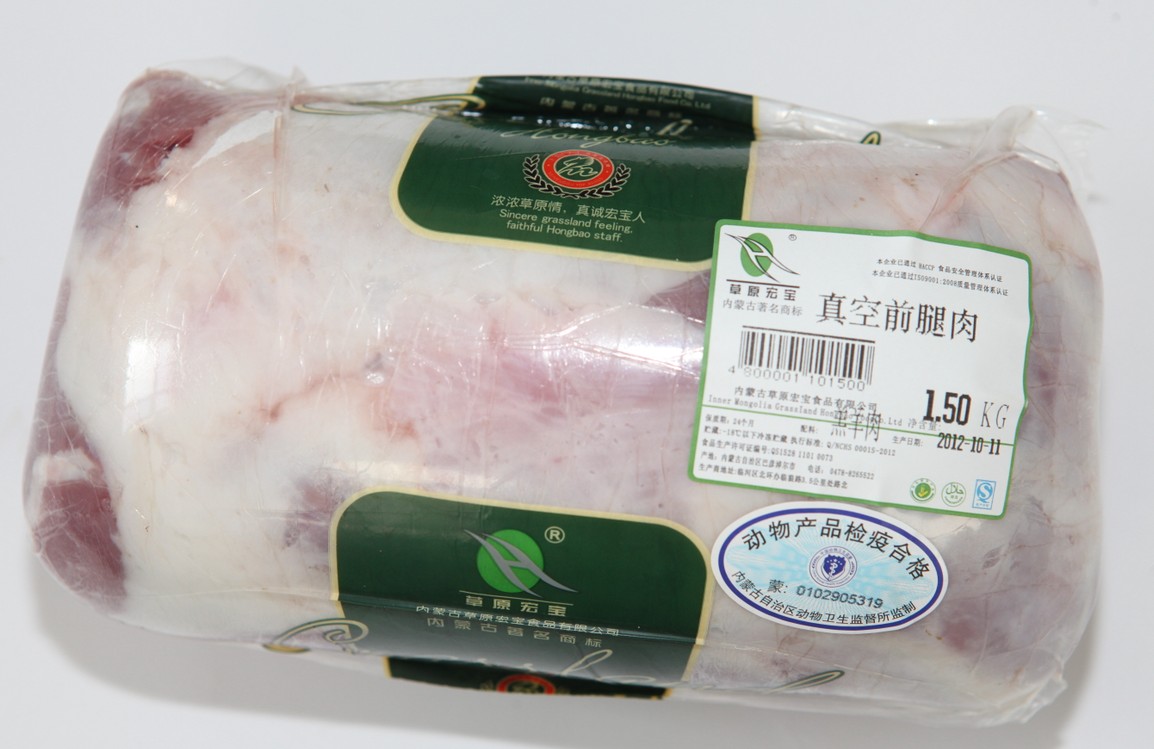 “草原宏寶”牌羊肉系列產(chǎn)品,從牧場(chǎng)養(yǎng)殖、屠宰分割到儲(chǔ)運(yùn)物流、商品貿(mào)易全產(chǎn)業(yè)鏈、全過(guò)程參照國(guó)家《良好農(nóng)業(yè)規(guī)范》及相關(guān)工廠、物流審核標(biāo)準(zhǔn)的要求實(shí)施可追溯控制生產(chǎn),確保安全無(wú)污染。所生產(chǎn)的原料全部選用牧場(chǎng)的優(yōu)質(zhì)羔羊,采用伊斯蘭教屠宰方式進(jìn)行吊宰,經(jīng)冷卻排酸、精細(xì)分割修選加工而成,被國(guó)家農(nóng)業(yè)部農(nóng)產(chǎn)品質(zhì)量安全中心認(rèn)證為“無(wú)公害食品”。