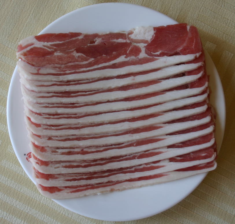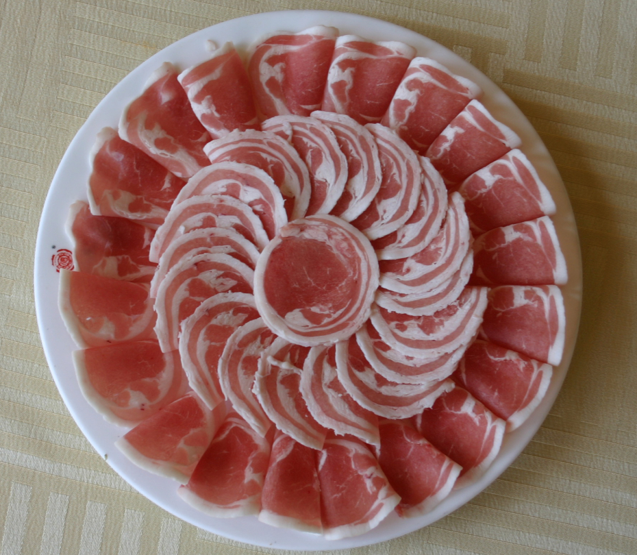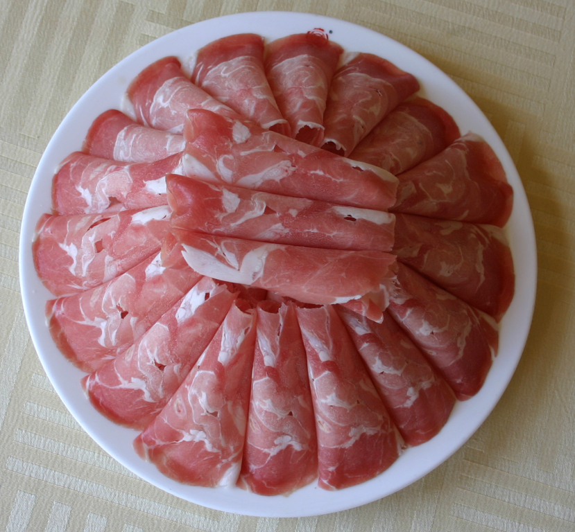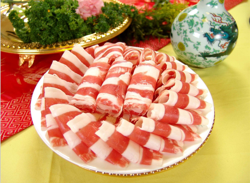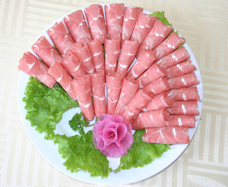 七、   杜泊羊肉卷:選用原料:采用南非引進的杜伯羊,經過雜交改良的品種。肉中脂肪分布均勻,胴體品質高。經選修之后,全部按照肥瘦搭配制成羊肉卷。一涮即熟、就涮不老。
