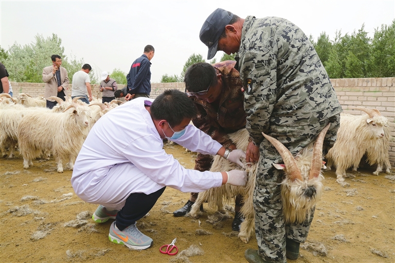 自治區(qū)纖維檢驗(yàn)局的技術(shù)人員在為鄂托克旗牧民選購的阿爾巴斯種公羊做羊絨活體檢測。