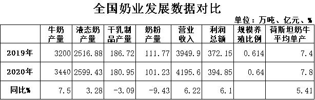 新冠肺炎疫情后,乳業(yè)成為逆勢增長的行業(yè)之一,乳企業(yè)績不斷好轉,整個行業(yè)的利潤總額同比降幅不斷收窄,10月利潤總額增幅由負轉正,今年以來首次轉為正值。隨著消費者對健康飲食更加重視,乳業(yè)的未來發(fā)展會更好。根據(jù)國家統(tǒng)計局數(shù)據(jù),2020年全國液態(tài)奶產(chǎn)量2599.43萬噸,同比增長3.28%;全國干乳制品產(chǎn)量180.95萬噸,同比下降3.09%;全國奶粉產(chǎn)量101.23萬噸,同比下降9.43%,其中12月份產(chǎn)量10.15萬噸,同比下降1.41%。規(guī)模以上乳企主營業(yè)務收入4195.58億元,同比增長6.22%;利潤總額394.85億元,同比增長6.10%,利潤總額增幅轉正,銷售利潤率9.41%。奶業(yè)轉型升級加快推進。全國奶牛規(guī)模養(yǎng)殖比例達到64%,同比提高2.6個百分點。全國荷斯坦奶牛平均單產(chǎn)超過7.8噸,同比增長400千克。