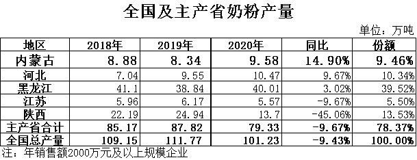 奶粉:根據(jù)國家統(tǒng)計局數(shù)據(jù),2020年全國奶粉產(chǎn)量101.23萬噸,同比下降9.43%,其中黑龍江產(chǎn)量40.01萬噸,同比增長3.02%,占總產(chǎn)量的39.52%,位居全國第一位;內蒙古產(chǎn)量9.58萬噸,同比增長14.90%,占總產(chǎn)量的9.46%,位居全國第四位。