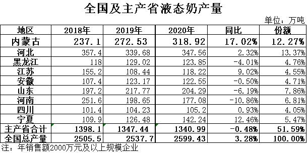 液態(tài)奶:根據(jù)國家統(tǒng)計局數(shù)據(jù),2020年全國液態(tài)奶產(chǎn)量2599.43萬噸,同比增長3.28%,其中12月產(chǎn)量234.28萬噸,同比下降2.30%。其中,河北產(chǎn)量347.56萬噸,同比增長2.32%,占全國總產(chǎn)量的13.37%,位居全國第一位;內蒙古產(chǎn)量318.92萬噸,同比增長17.02%,占全國總產(chǎn)量的12.27%,位居全國第二位。