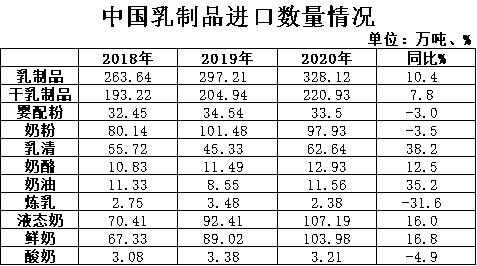 2020年我國共計進口各類乳制品328.12萬噸,同比+10.4%,進口額117.06億美元,同比+5.2%,折合生鮮乳1875萬噸,同比+8.3%(干制品按1:8,液態(tài)奶按1:1折算)。