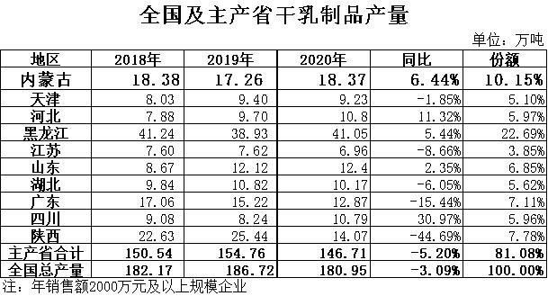 干乳制品:根據(jù)國家統(tǒng)計局數(shù)據(jù),2020年全國干乳制品產(chǎn)量180.95萬噸,同比下降3.09%,其中12月份產(chǎn)量16.85萬噸,同比增長4.19%。其中黑龍江產(chǎn)量最高,41.05萬噸,同比增長5.44%,占全國總產(chǎn)量的22.69%位居全國第一位;內蒙古產(chǎn)量19.37噸,同比增長6.44%,占全國總產(chǎn)量的10.15%,位居全國第二位。